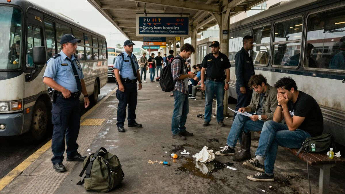 This image depicts a crowded, seedy Greyhound bus station filled with weary passengers, vagrants, and security guards. Spilled liquid and trash highlight the gritty atmosphere.