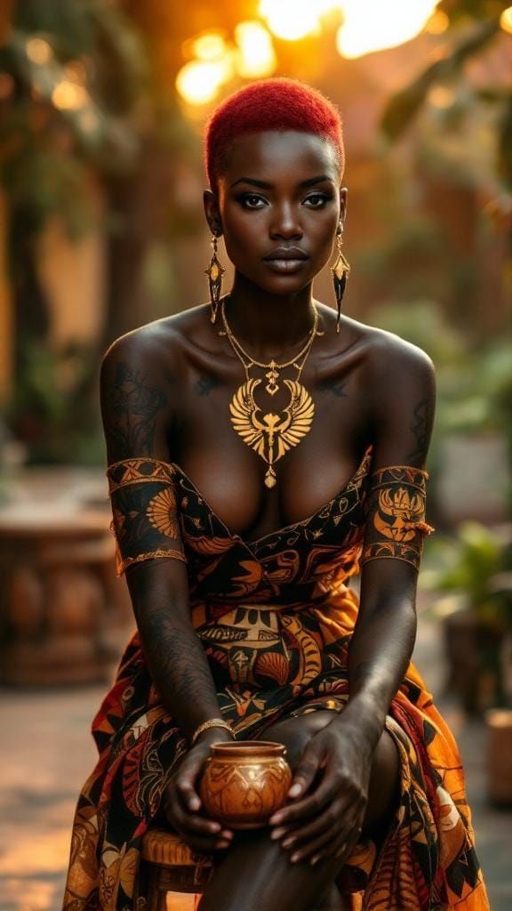 This image shows a dark-skinned woman with a striking red, geometric haircut, adorned with traditional African tattoos. She is sitting in a Ghanaian courtyard at sunset, wearing a kente cloth dress, presented with photorealistic detail.