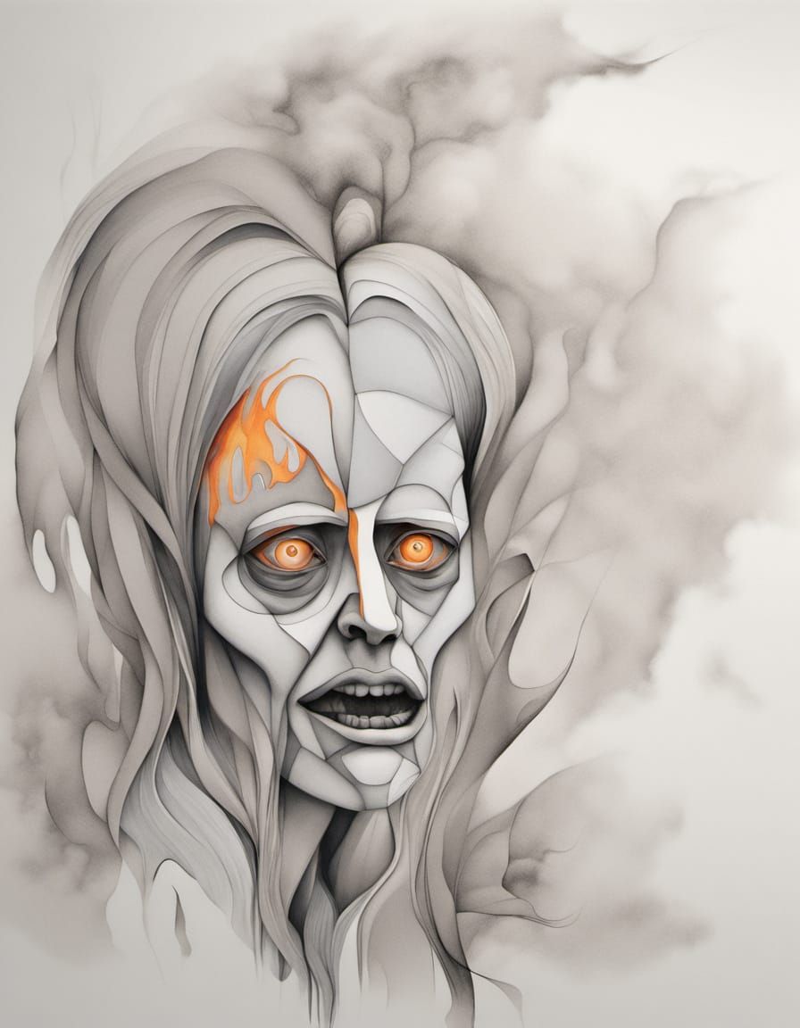 This haunting image captures a frozen moment of emotional turmoil, as Catherine stands frozen in a surreal dreamscape, surrounded by eerie shadows and flickering firelight. A dynamic, abstract composition with blurred lines and muted colors, evoking a sense of mystery and unease.