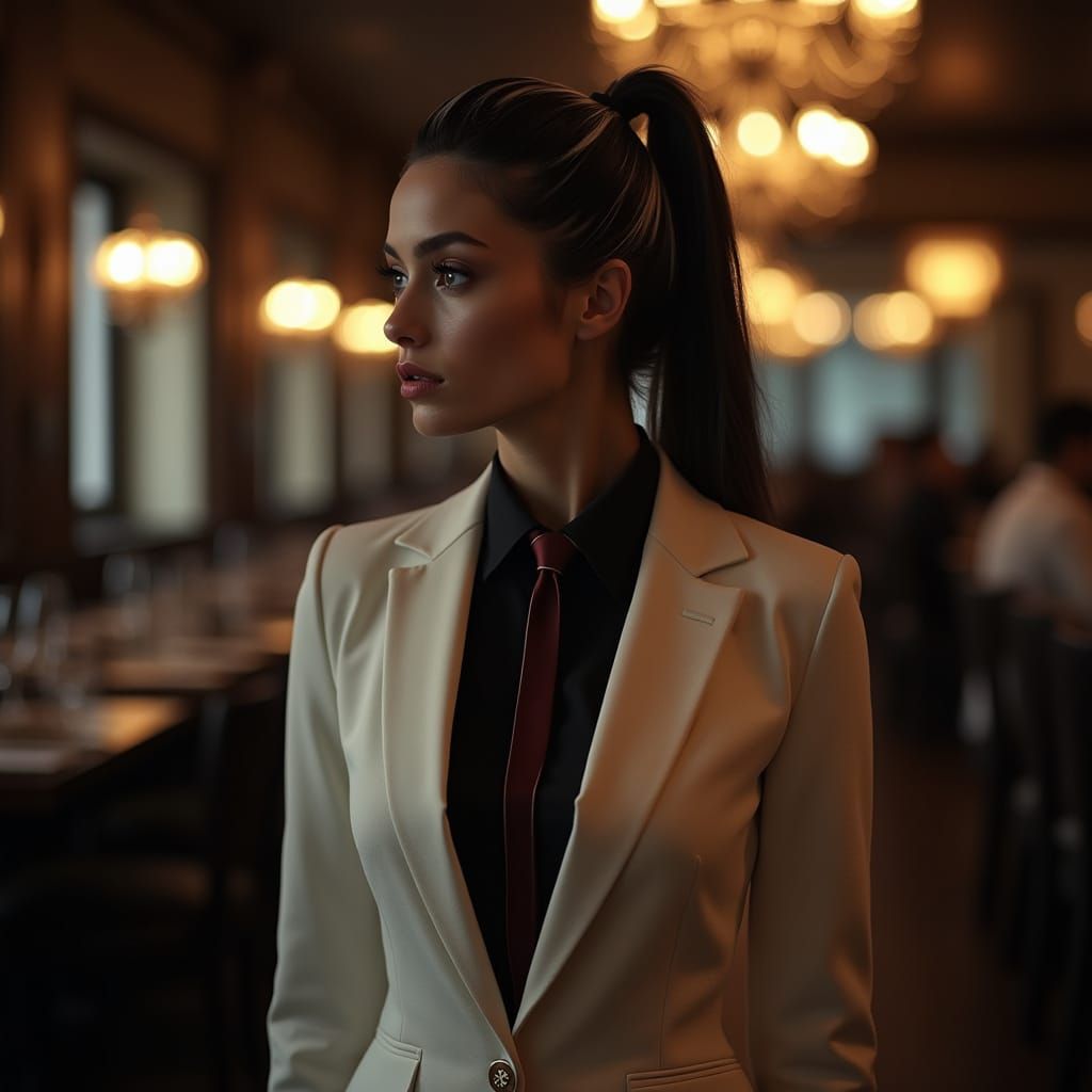This image shows a hyperrealistic portrait of a pale woman with streaked hair in a business suit, set in a moody restaurant at midnight with dramatic lighting. Captured with a cinematic lens effect.