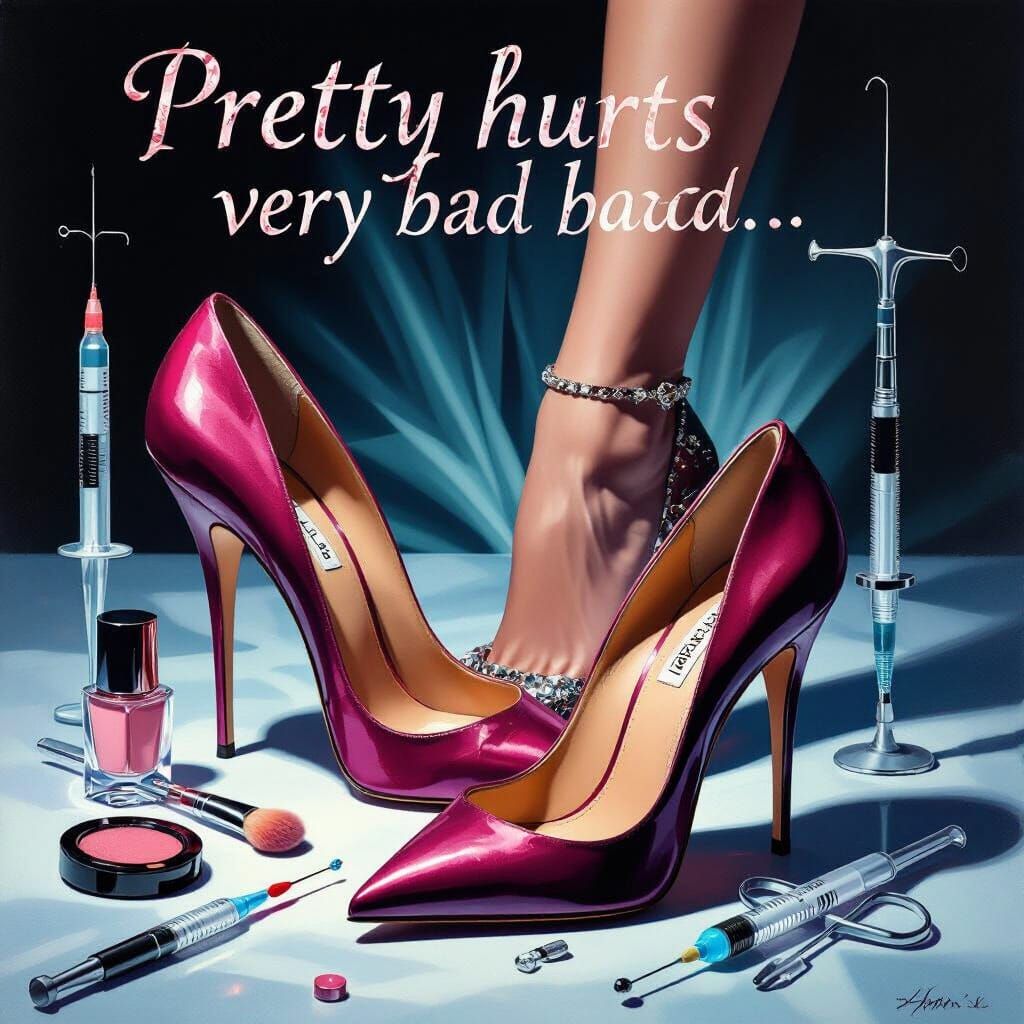 This surrealist artwork contrasts makeup and heels with surgical tools, highlighting the duality of beauty and pain. Vivid colors and dramatic lighting create a striking visual statement.