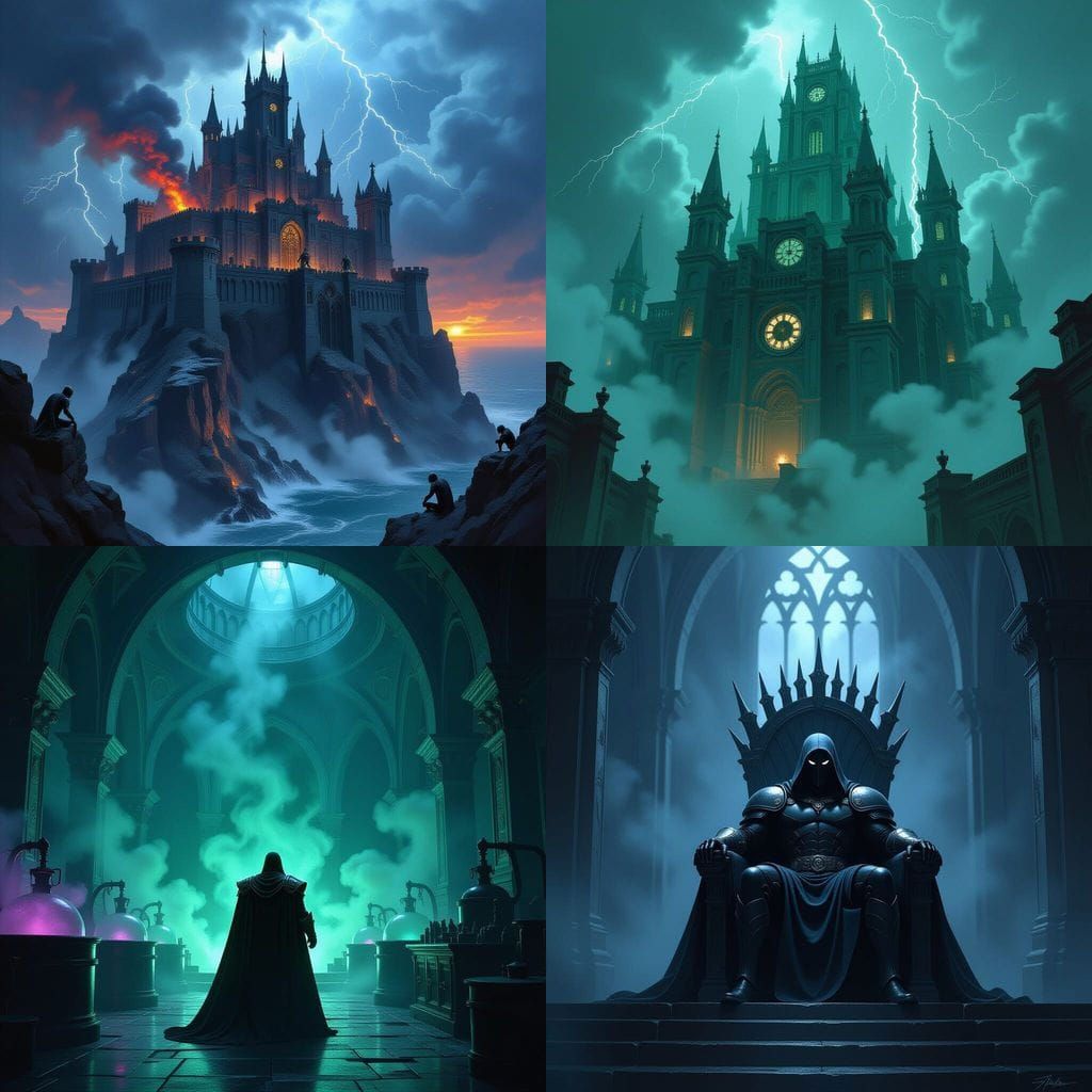 This image depicts Dr. Doom's imposing fortress. Explore the grim and powerful architecture of his secret lair in this captivating visual.