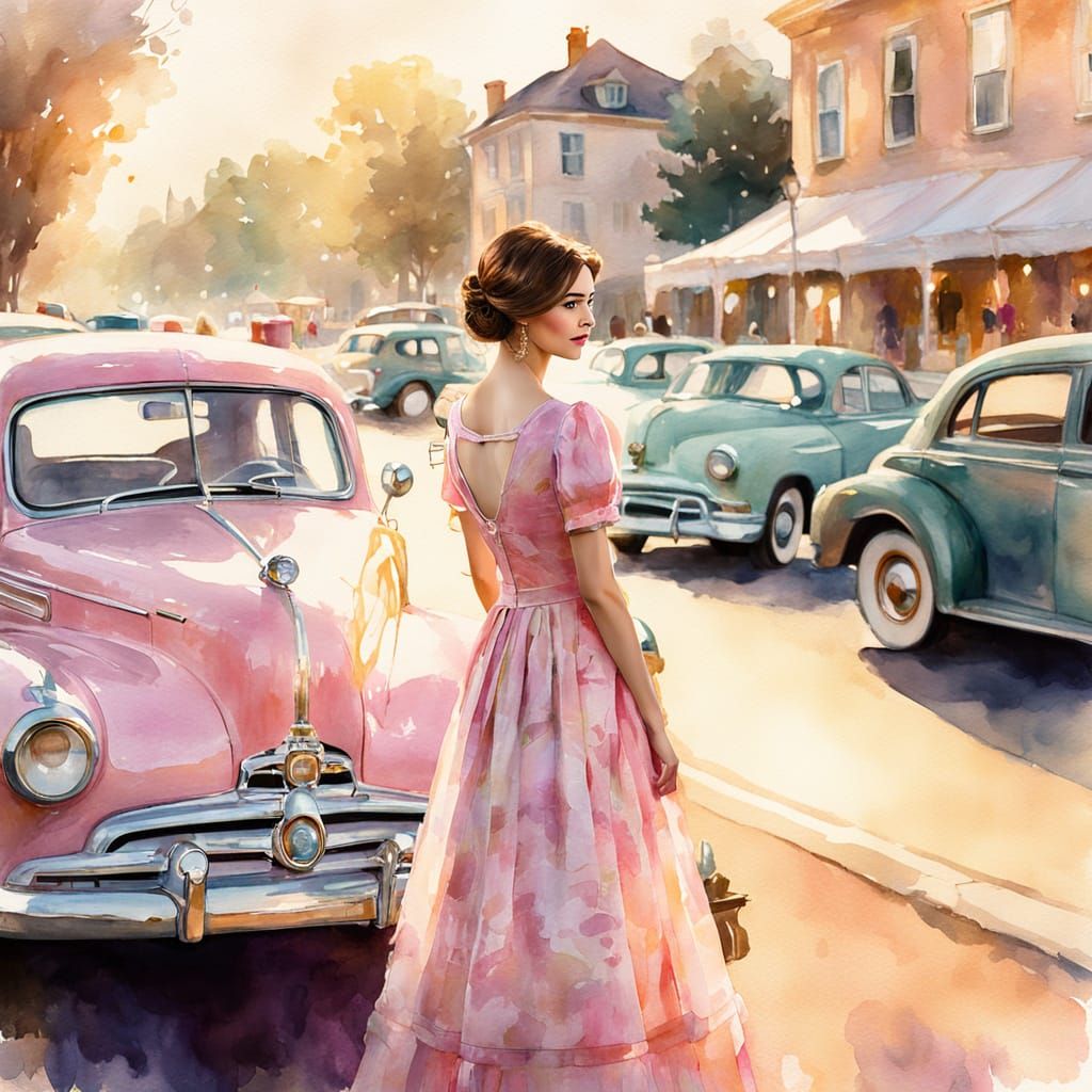 This image shows a beautiful woman in a pink vintage dress standing beside a vintage car in a charming London street scene, with soft brushstrokes and warm golden lighting, evoking a whimsical watercolor style.