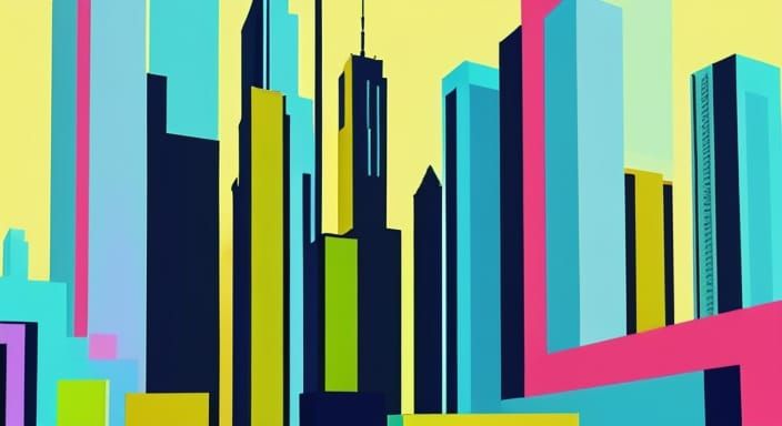 This image shows a futuristic virtual reality cityscape filled with skyscrapers. The colorfield painting style features wild brushstrokes and a palette of bright pastel hues, creating a kaleidoscopic, layered effect in a digital art style.
