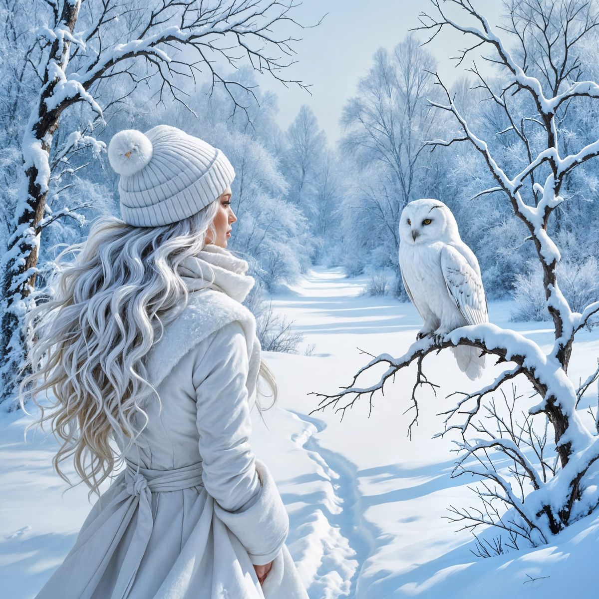 This image depicts a woman in white winter attire stepping into a surreal, monochromatic snowy landscape. A white snow owl is visible in the distance, creating a dreamlike scene.