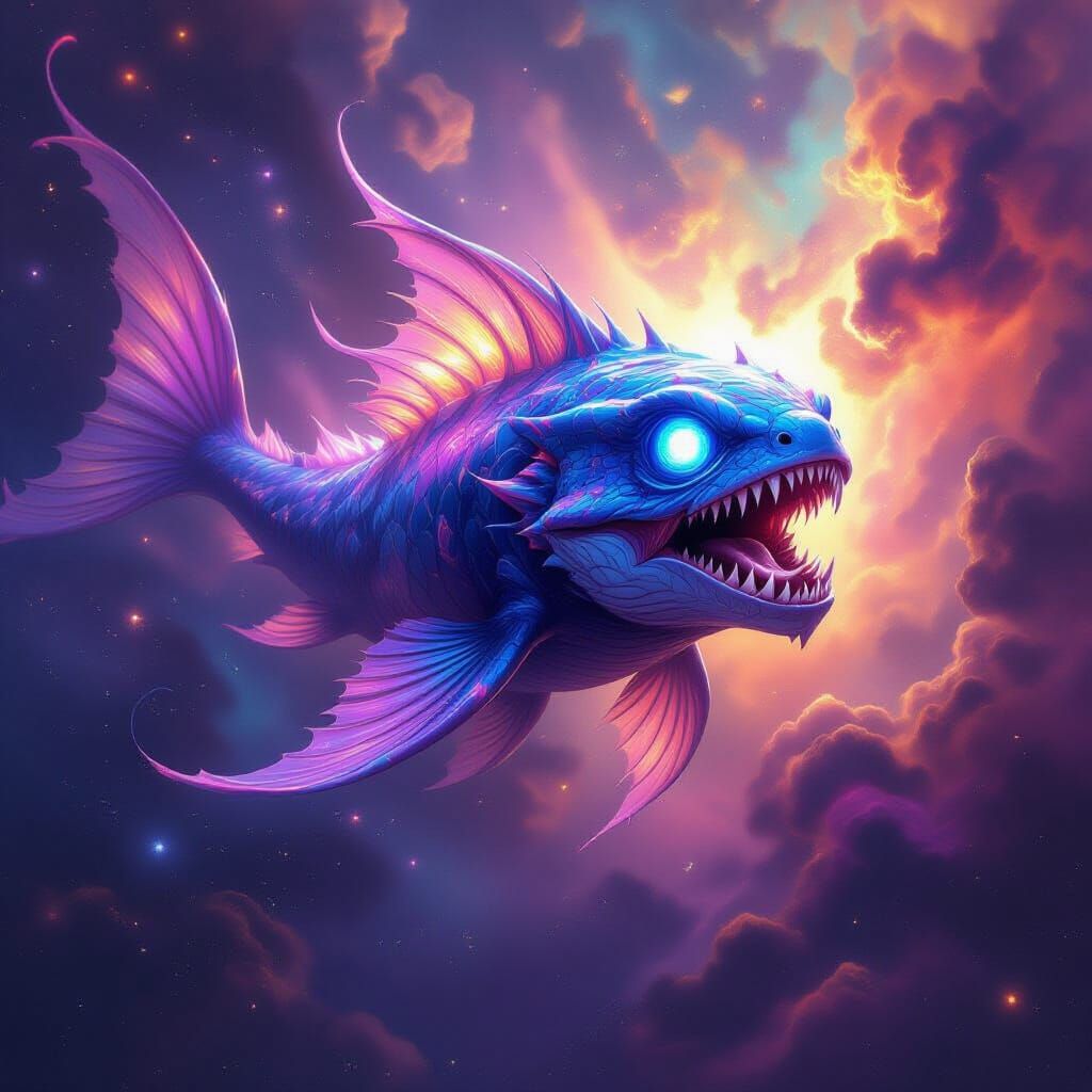 This hyperrealistic digital painting features a fantastical creature with glowing blue eyes and sharp teeth, mid-leap through a vibrant nebula. Intricate details and dramatic lighting highlight its bioluminescent scales.