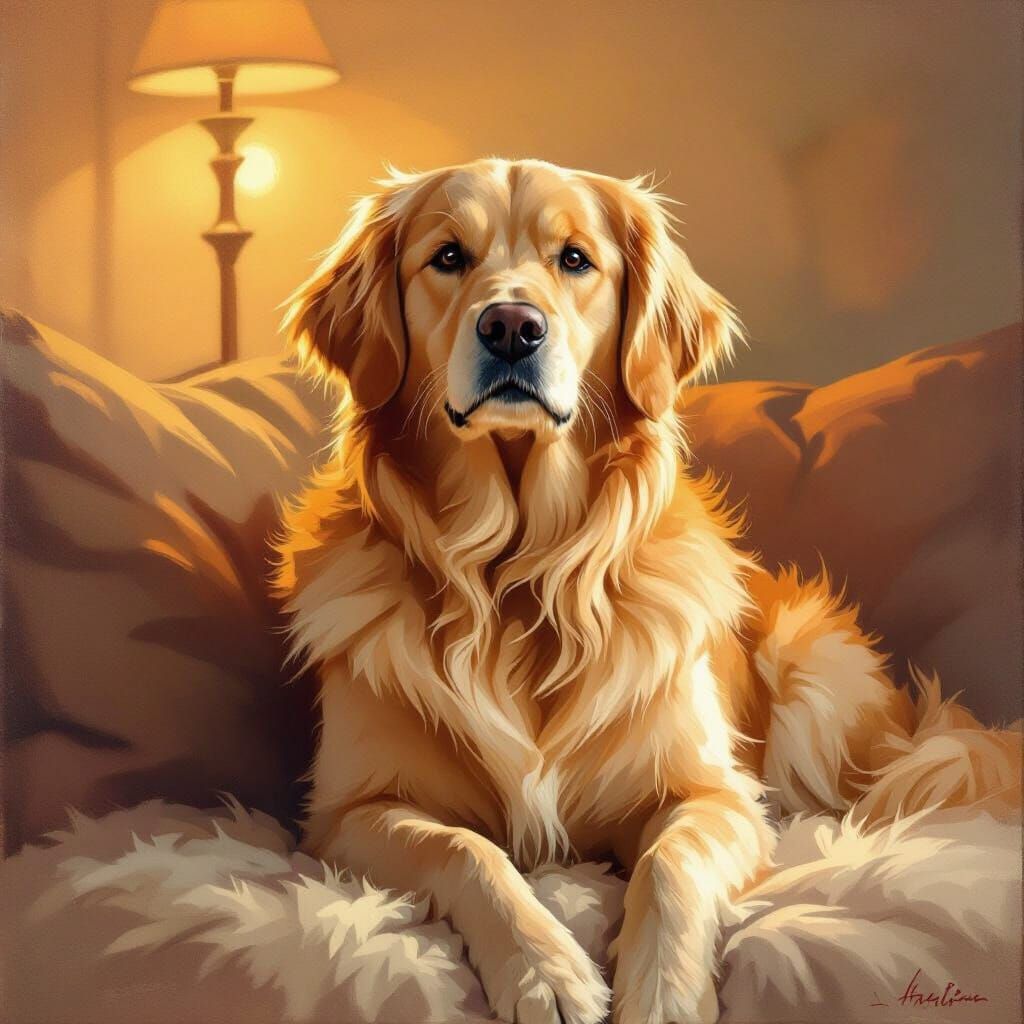 A heartwarming image of Isla, a golden retriever, relaxing in warm, inviting lighting. The artwork evokes modern animal paintings with impressionistic colors and intimate portraiture.