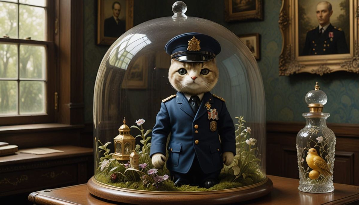 This image shows a miniature English policeman giving a massage in a serene, intricately crafted glass bottle parlor, with delicate lace curtains and polished dark wood accents, evoking a sense of refinement and luxury.