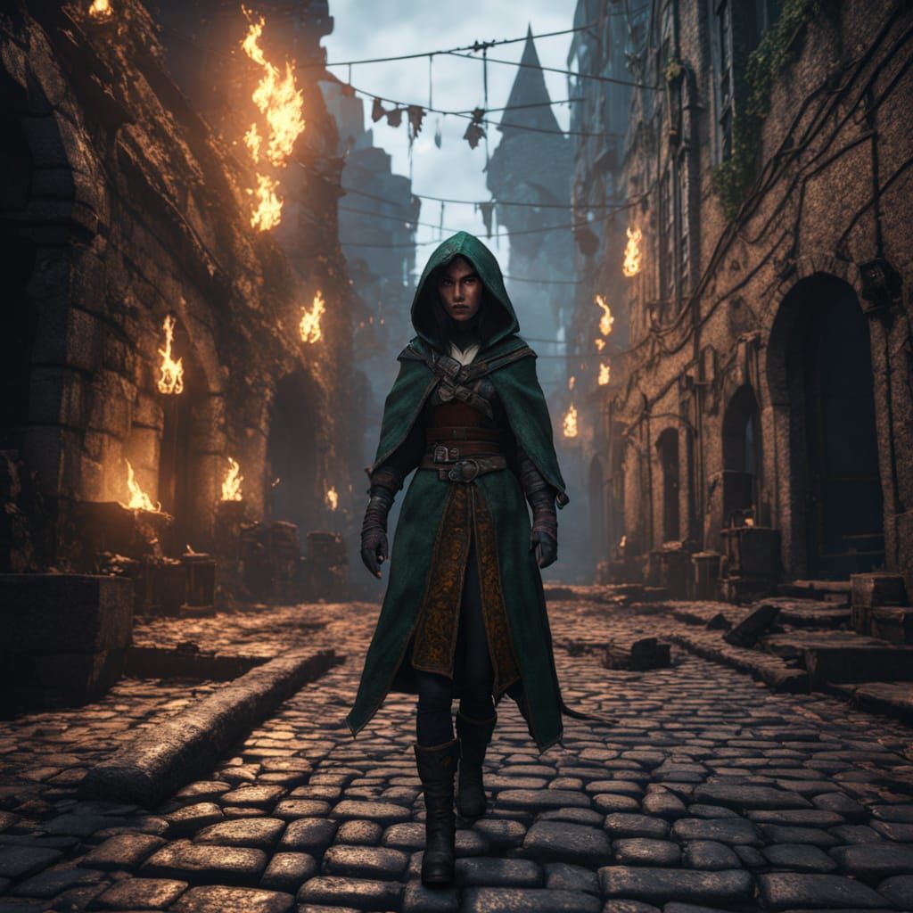 This 3D rendered image showcases a half-elf sorceress with emerald eyes and wavy black hair, engulfed in magical fire within a dark, grimy alley. The dynamic lighting and intricate details create an epic, cinematic feel.