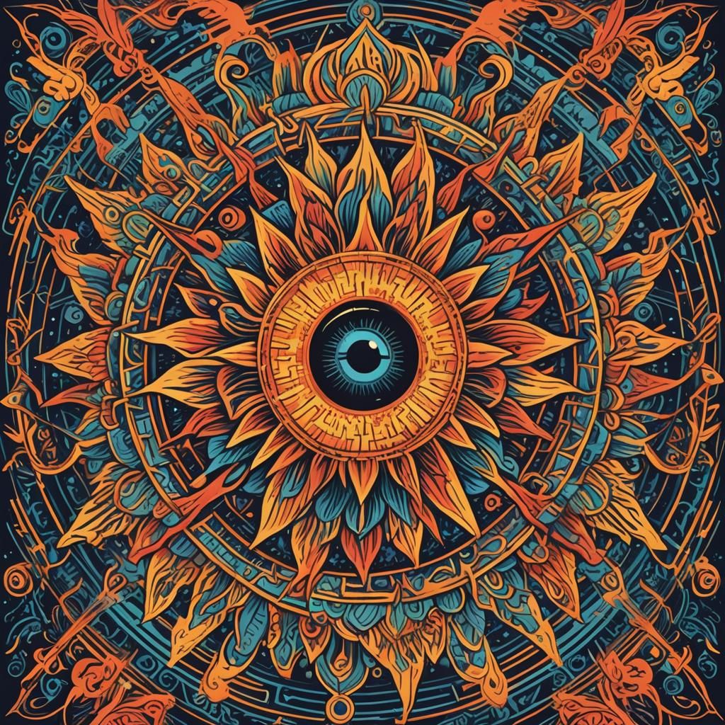 A vibrant, psychedelic image featuring a third eye within an all-seeing sun. The symmetrical vector design incorporates posterized colors, creating a retro, vintage aesthetic.