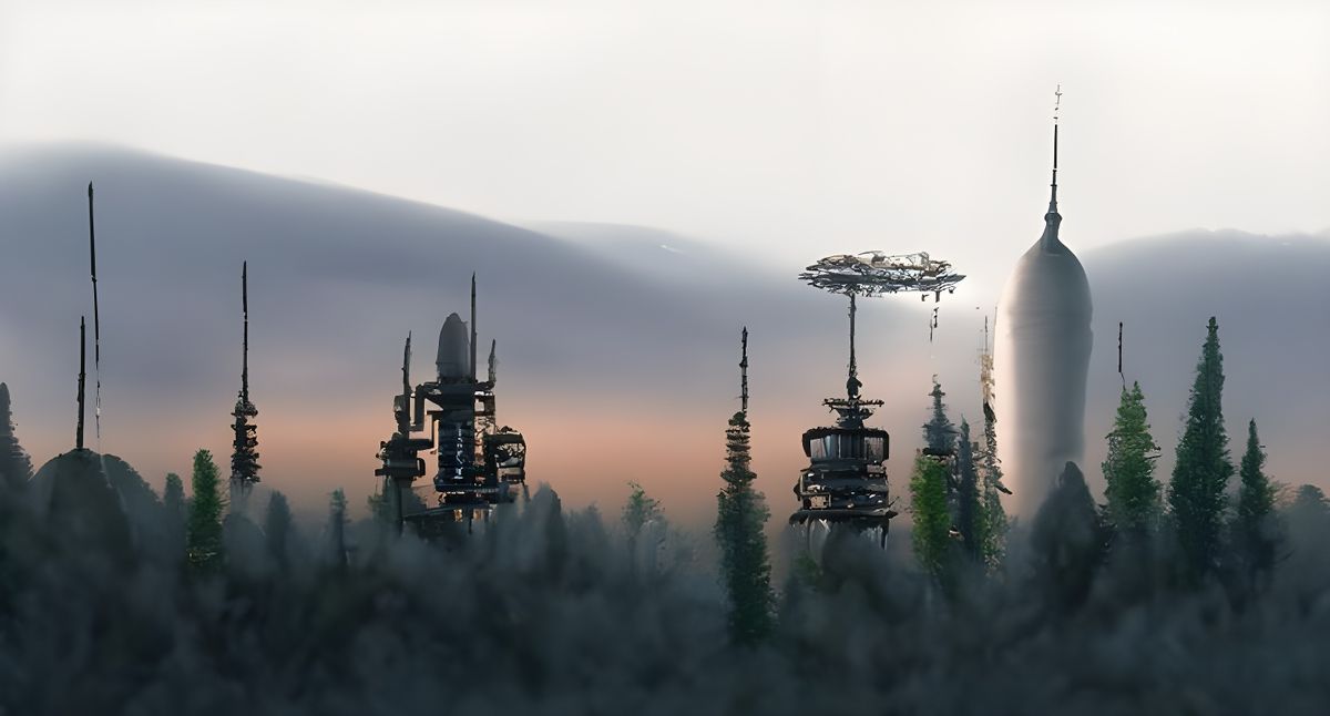 This image shows a secret space station with antennae on a forest planet at twilight. The low sun reflects everywhere through mist and clouds, with small spacecraft in the air as photorealistic cyberpunk.