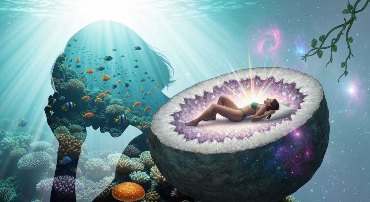 This image shows a woman's silhouette created with a double exposure of a coral reef and cosmic energy. Sunlight illuminates exotic fish in an ethereal, dreamlike fantasy aesthetic. The artwork emphasizes interconnectedness.