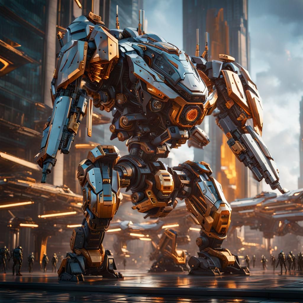 A striking picture of a sniper with intricate mechanical details, positioned at a plaza. This ground-level shot captures a futuristic, sci-fi scene with a cinematic and dramatic atmosphere.