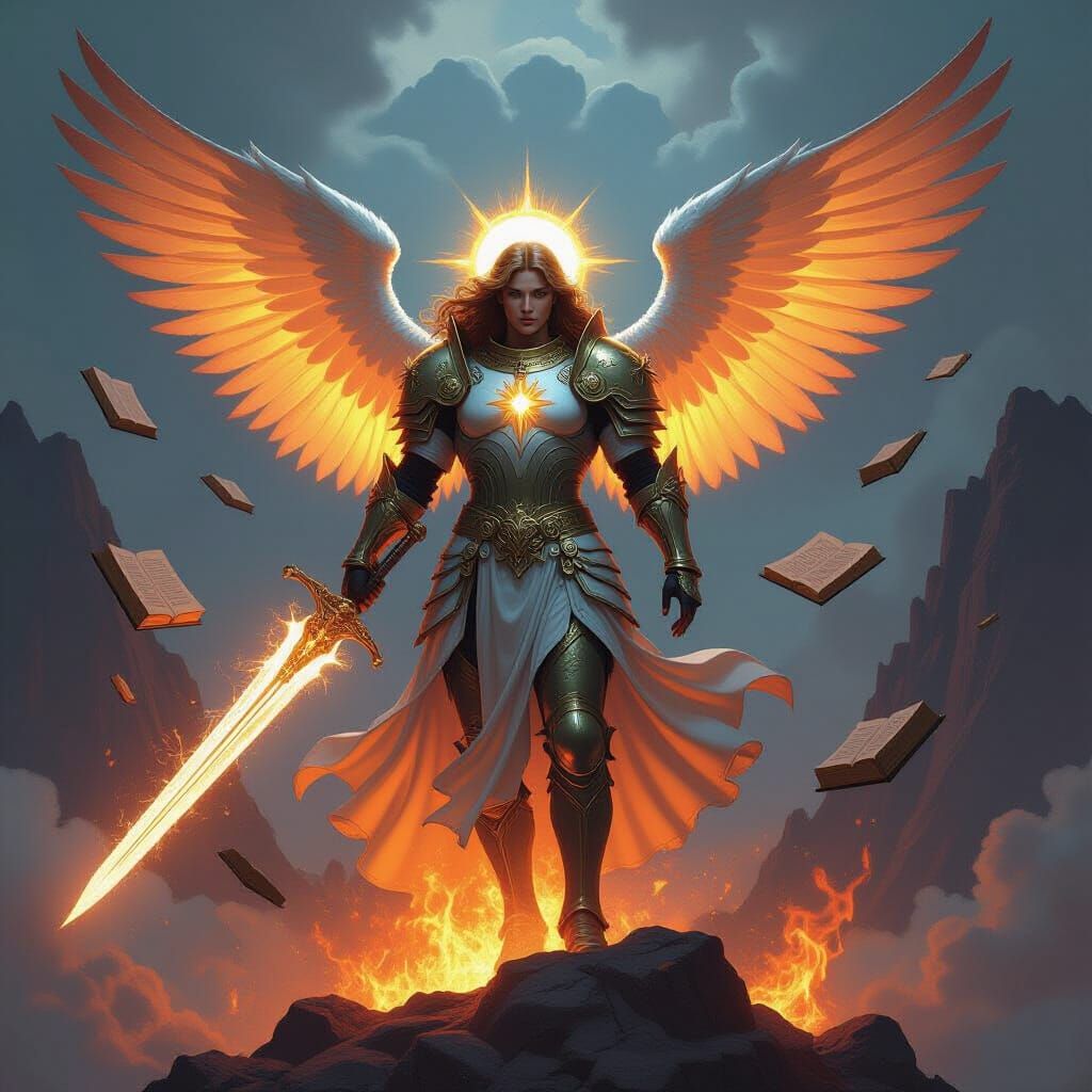 A striking picture of Archangel Uriel, radiant in bronze and gold armor with fiery wings. The angel stands on a mountain amidst floating books, rendered with dynamic lighting and epic detail.