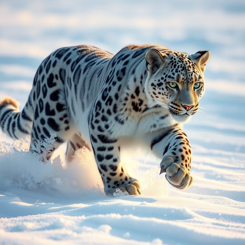 This breathtaking image shows a snow leopard running in a serene snow-covered landscape, surrounded by delicate snowflakes and crisp, icy air. Rendered in stunning 8K resolution, the image features intricate details and a vibrant, high-fantasy aesthetic, reminiscent of concept art from Artstation and Pix...