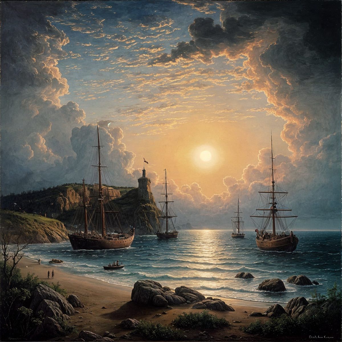 A dramatic seascape featuring corvettes silhouetted against a sunset and moonlit sky. The scene evokes 19th-century Romanticism with oil paint and sublime natural elements.
