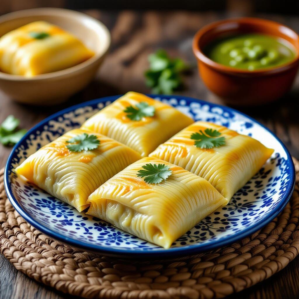 A close-up photograph of four corn tamales on a blue and white Talavera plate. One tamale is open, revealing a chicken and salsa verde filling. The image captures the dish with soft natural light and vibrant colors.