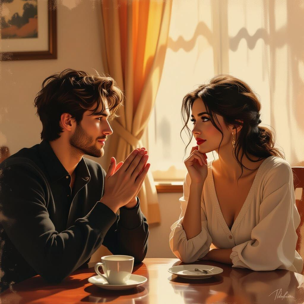 This image contrasts a person's ominous 'yes' with a calm 'no' in a peaceful setting, featuring warm colors and dramatic lighting reminiscent of Caravaggio.