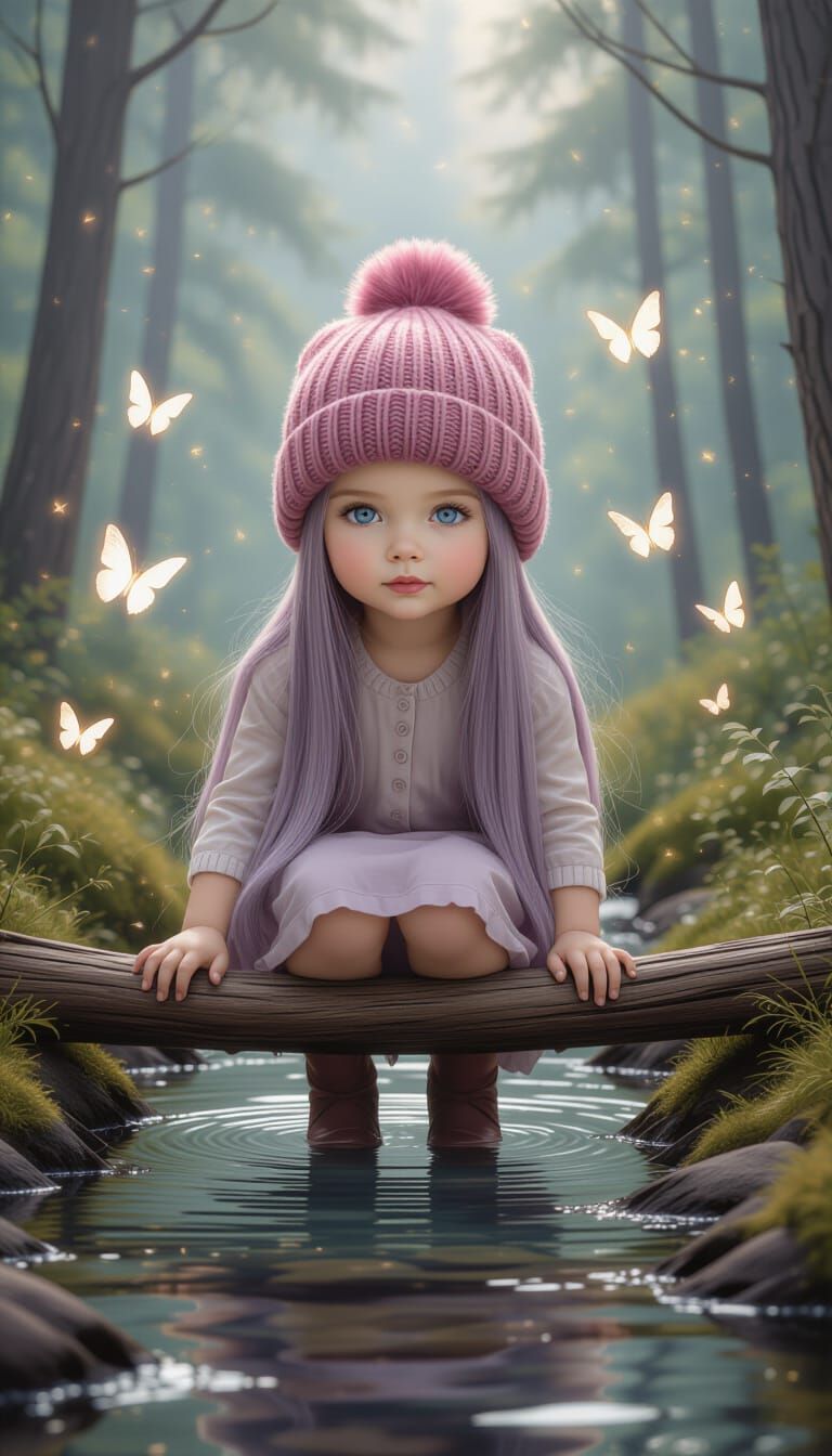 This image shows a lifelike young girl with lilac hair and blue eyes crossing a log over a stream in a magical forest. Luminous butterflies surround her in soft green, lilac, and gold hues.