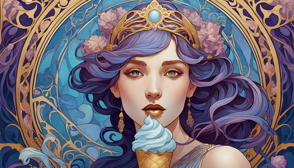 This image shows an Art Nouveau-style illustration of an elegant woman composed of flowing ice cream. Soft pastel colors, golden lighting, and intricate borders complete the fantastical portrait.