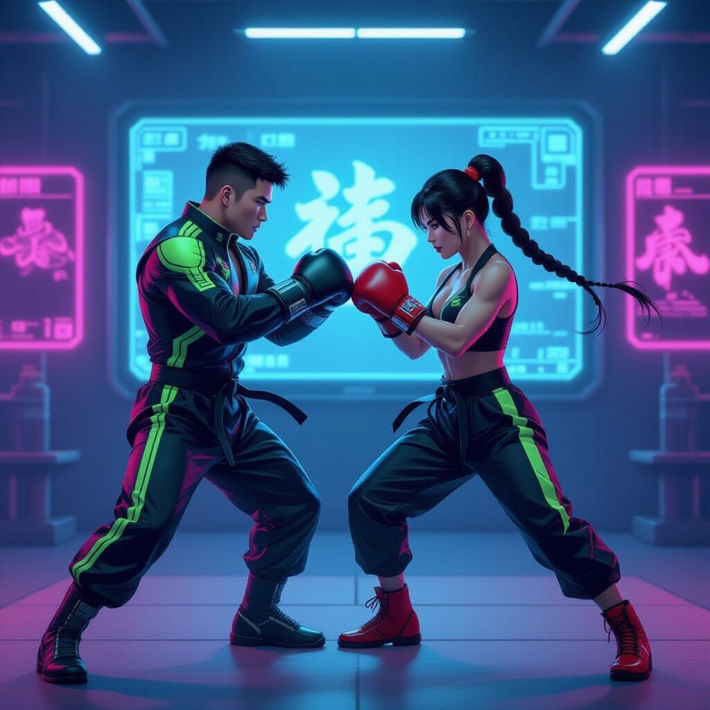 This image shows a futuristic scene of a male pugilist flirting with a female fighter in a high-tech dojo. The characters are rendered in a vibrant, dynamic, and energetic digital art style.