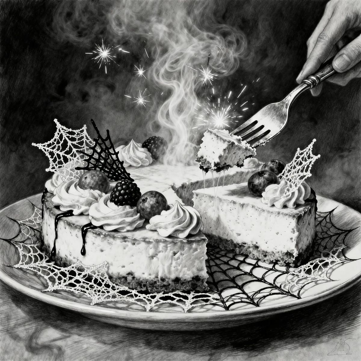 This image shows a photorealistic charcoal sketch of cheesecakes with fruit and sugar lace, illuminated by mystical fog and dramatic lighting. A fork and knife suggest an ethereal diner.