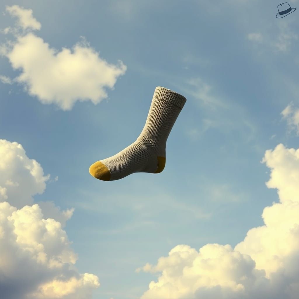 This image depicts a single sock mysteriously floating in a surreal, cloud-filled sky, inspired by Rene Magritte's style. Realistic texture and illogical placement evoke dreamlike wonder.
