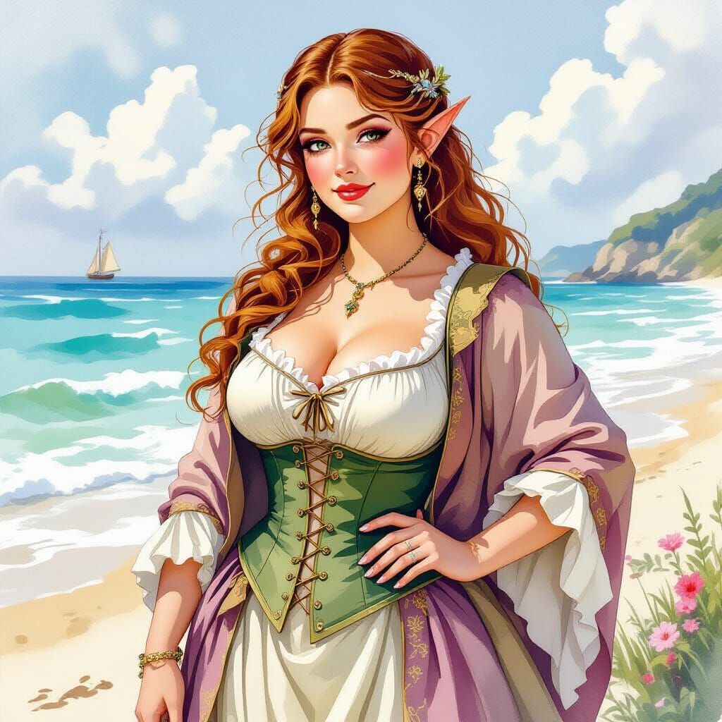A vibrant rococo-style watercolor of a plus-sized elf courtier and a friend on a beach. The image evokes the elegance and portraiture of the late 18th century.