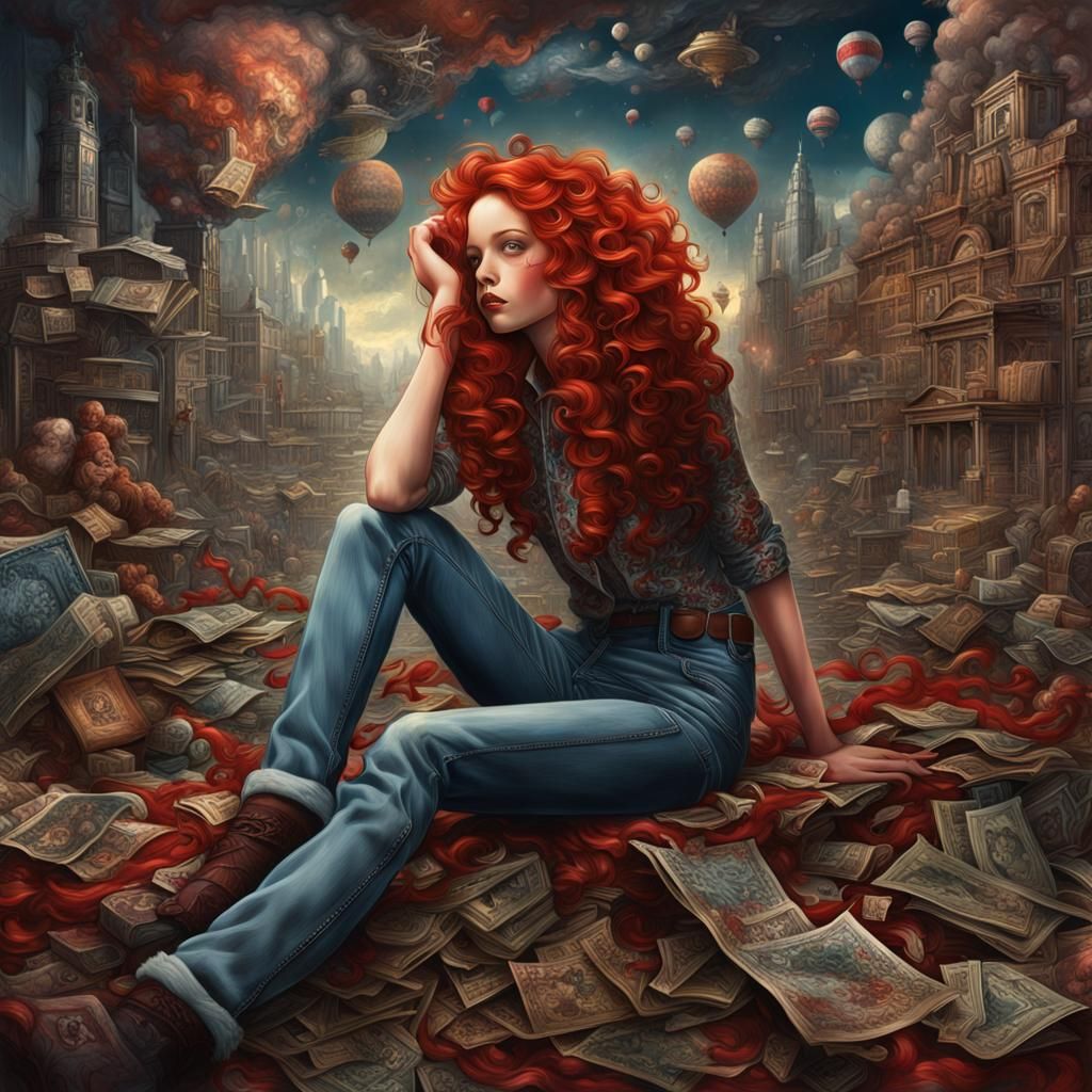 A cinematic image of a girl with curly red hair wearing high-waisted jeans. This detailed matte painting features deep colors, intricate detail, and complementary colors in a fantastical style.