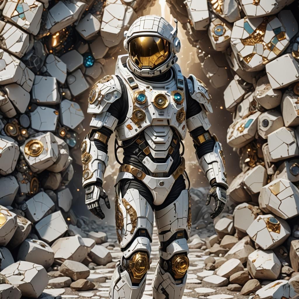 A striking picture of a biomechanical astronaut in white mosaic armor. The astronaut stands amid square white rocks, rendered with dramatic lighting, metallic accents, and ecological overgrowth in a hyper-realistic digital painting.