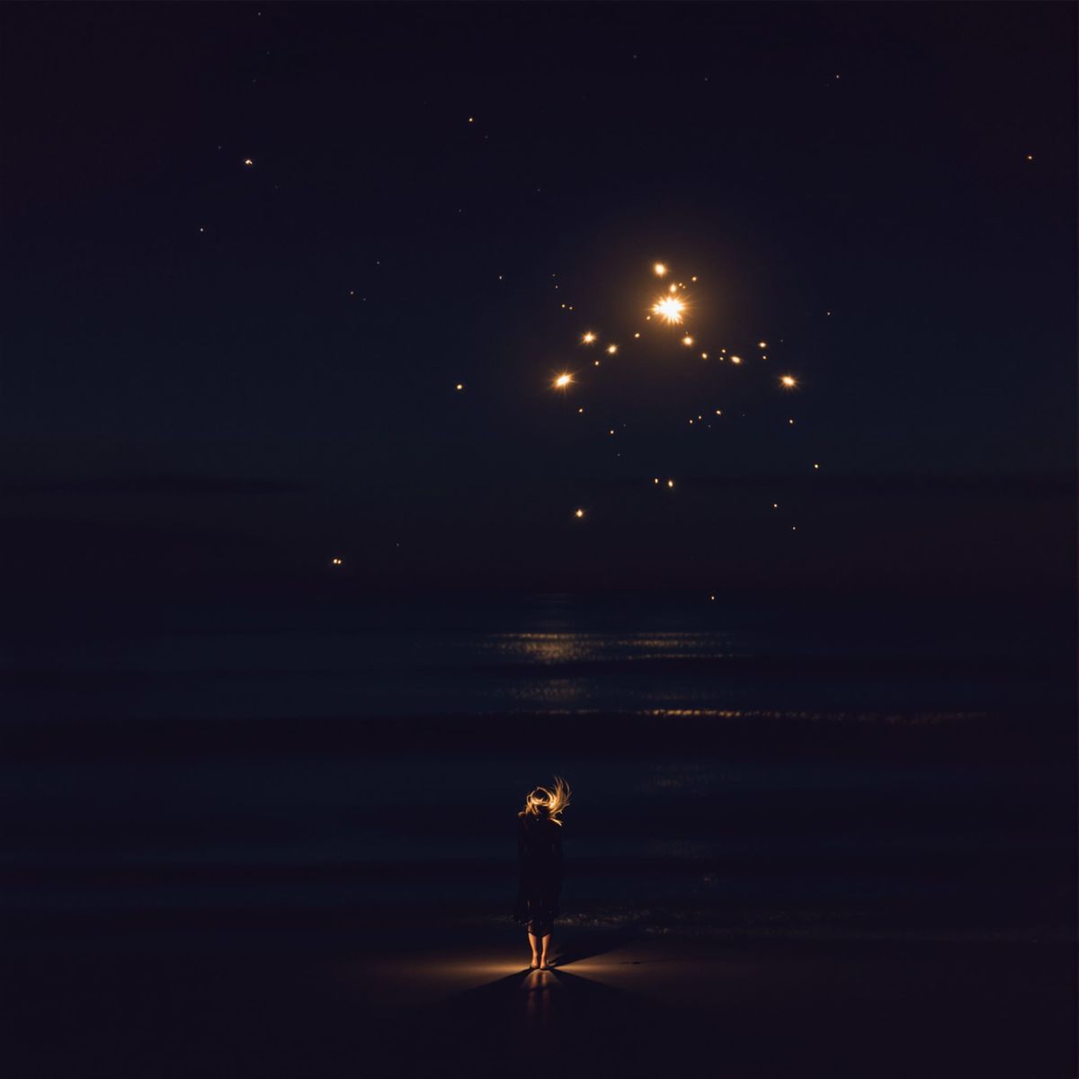 This image captures a solitary woman on a shore, watching the final firework spark fade over the ocean as twilight descends. It evokes a poetic and sublime atmosphere.