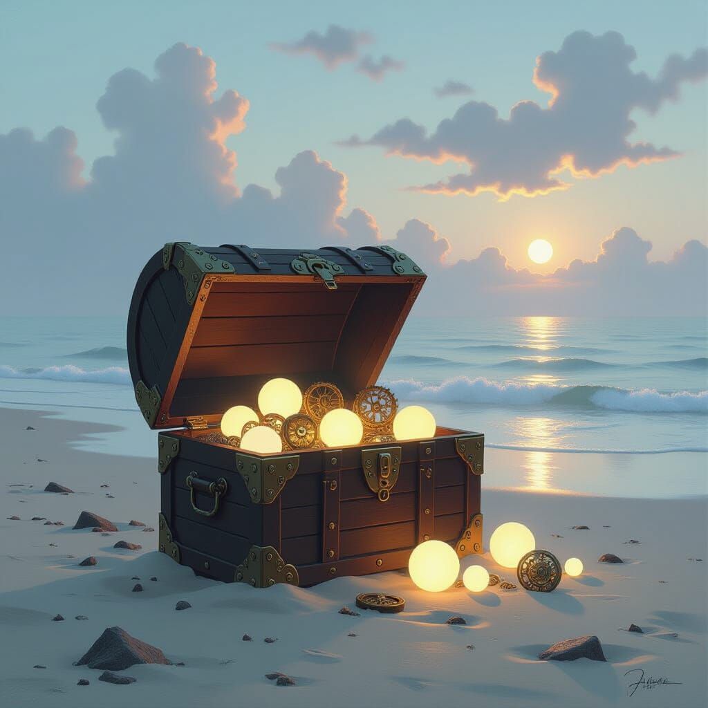 This image shows an antique treasure chest open on a misty beach, spilling glowing orbs and clockwork parts. The scene has a dreamlike, painterly quality evoking mystery and nostalgia.