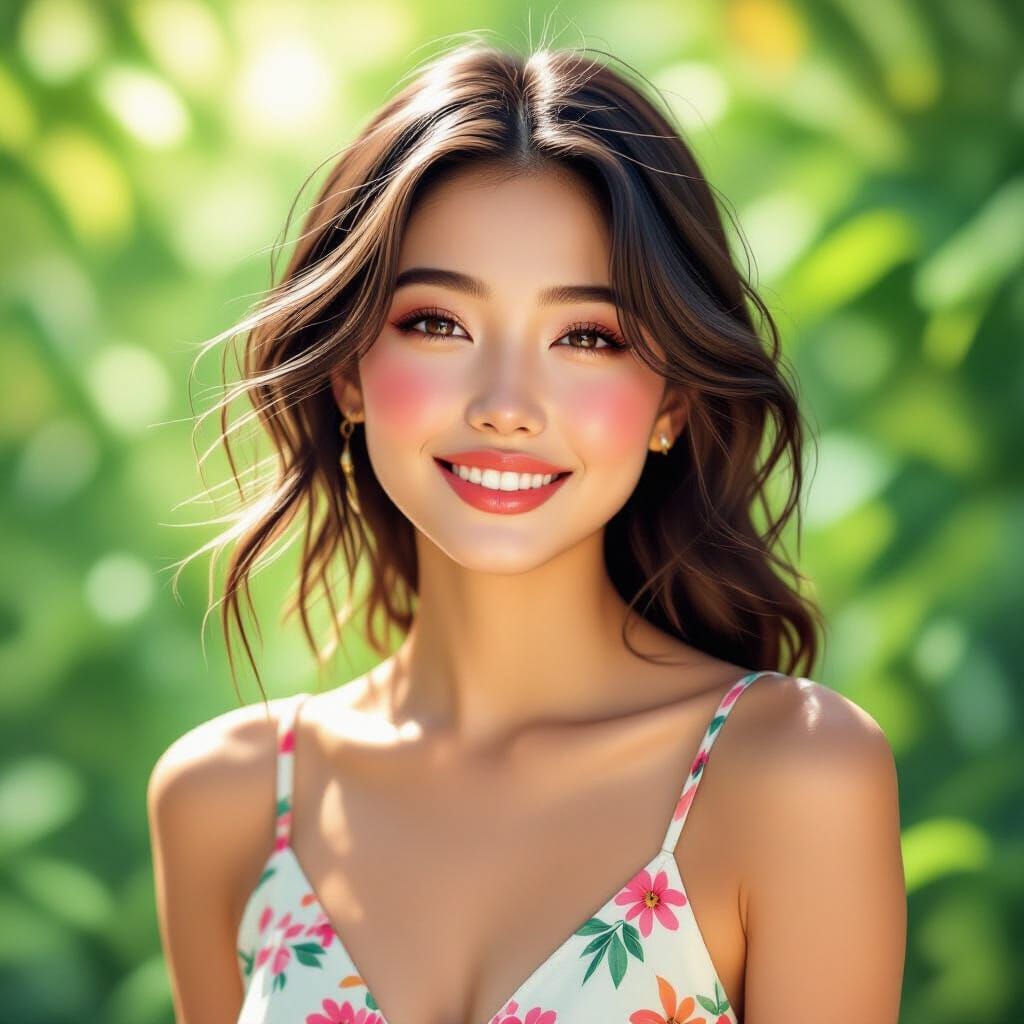 A close-up of a smiling young woman bathed in sunlight. This image showcases lush greenery and a vibrant color palette, reminiscent of a whimsical pop surrealist painting.