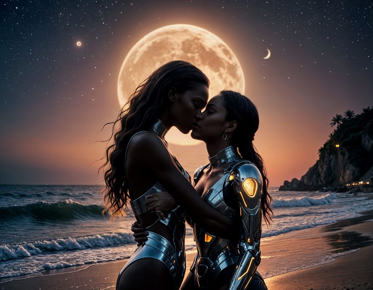 This image shows two futuristic cyborg women embracing on a beach under moonlight. The scene is captured with a shallow depth of field, film grain, and vibrant, cinematic lighting, creating a passionate and atmospheric moment.