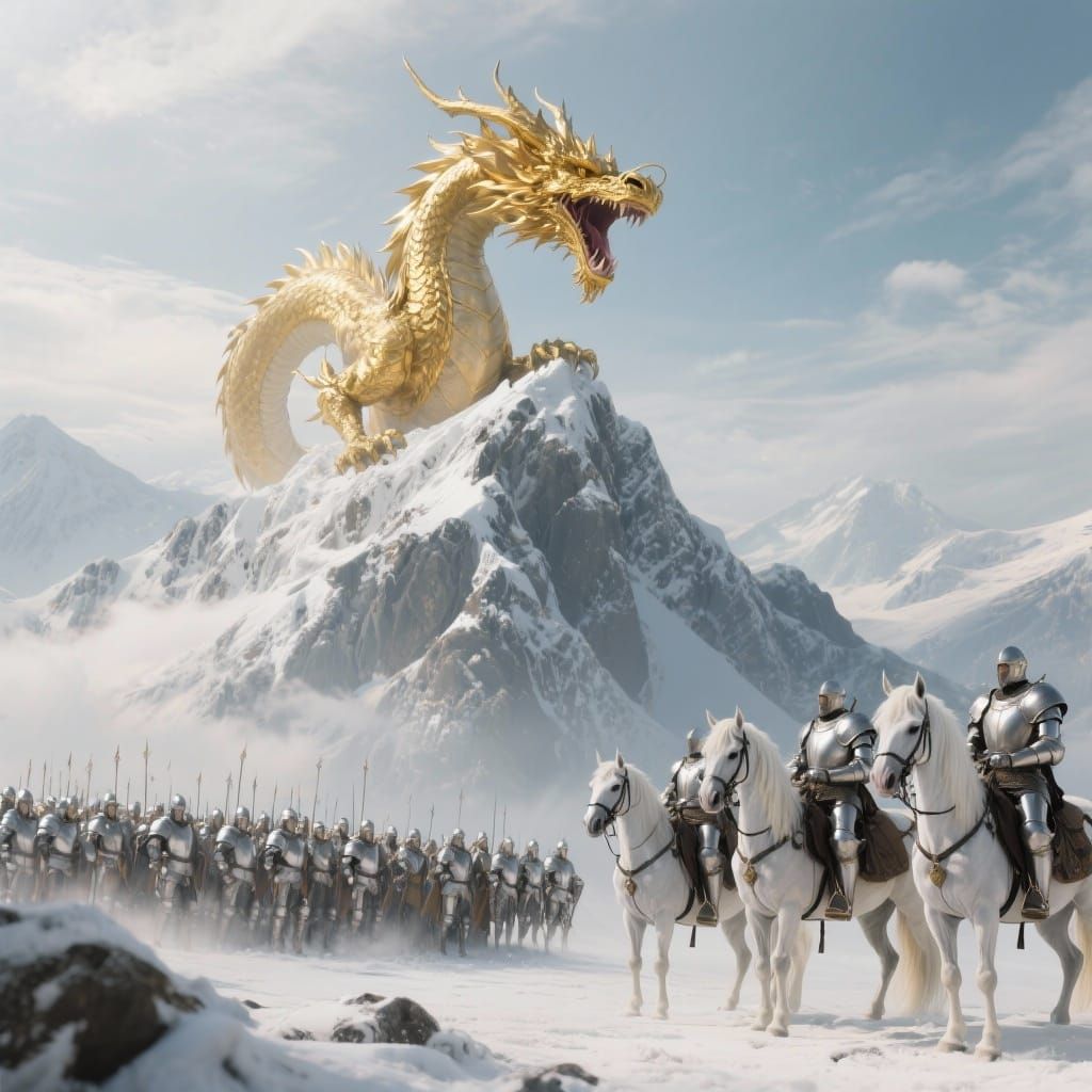A majestic golden dragon overlooks a valley where an army of silver-armored warriors and unicorn riders prepare for battle. Captured in sharp focus with natural light.