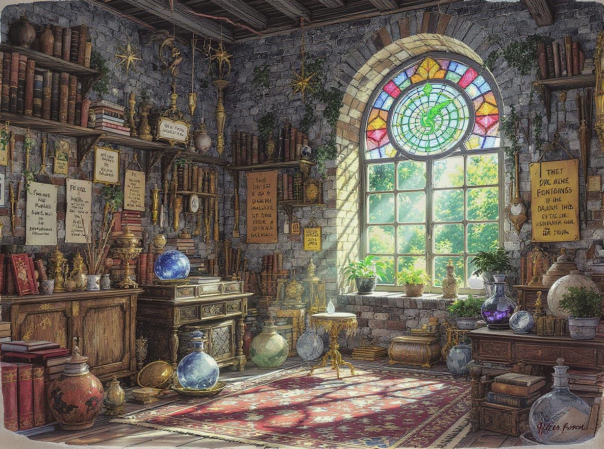 This image shows the interior of a magic shop filled with wands, astrology equipment, and potion bottles. Sunlight streams through a stained-glass window in this fantasy scene.