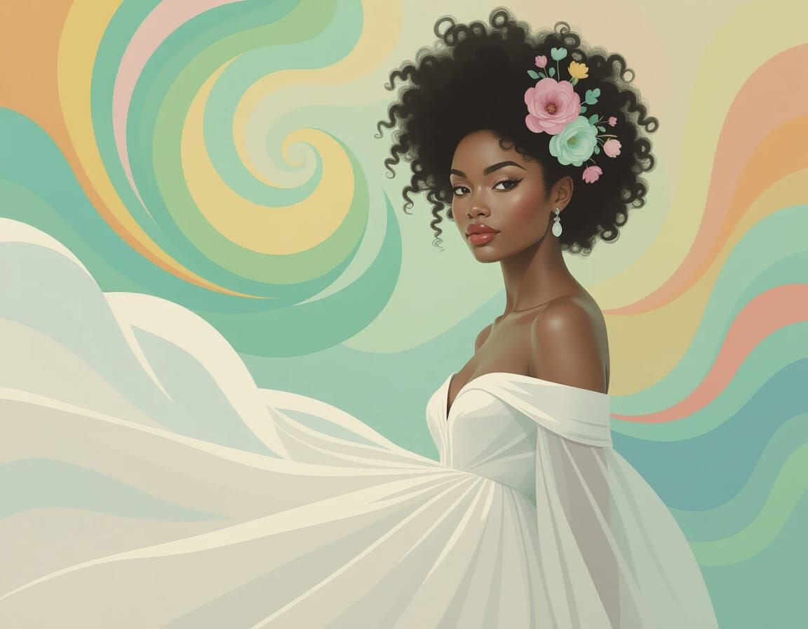 This image shows a black woman with a high puff hairstyle decorated with pastel flowers. She wears a flowing white gown, set against a swirling pastel background, creating a dreamlike, impressionistic scene.