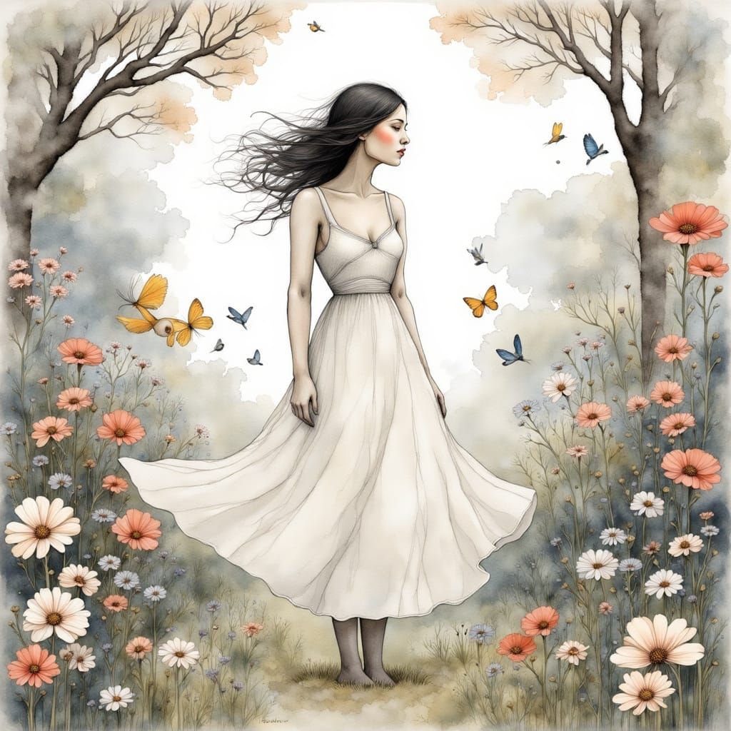 This image shows a woman in a white dress amidst floral patterns and a cottagecore scene. The artwork evokes watercolor illustrations with delicate digital art elements.