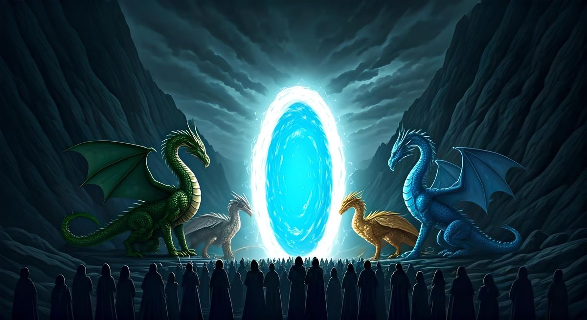 A dramatic image shows a bright blue portal between two mountains. Crowds of people stand before it, guarded by four dragons: green, silver, gold, and blue, set against a dark, cloudy sky.