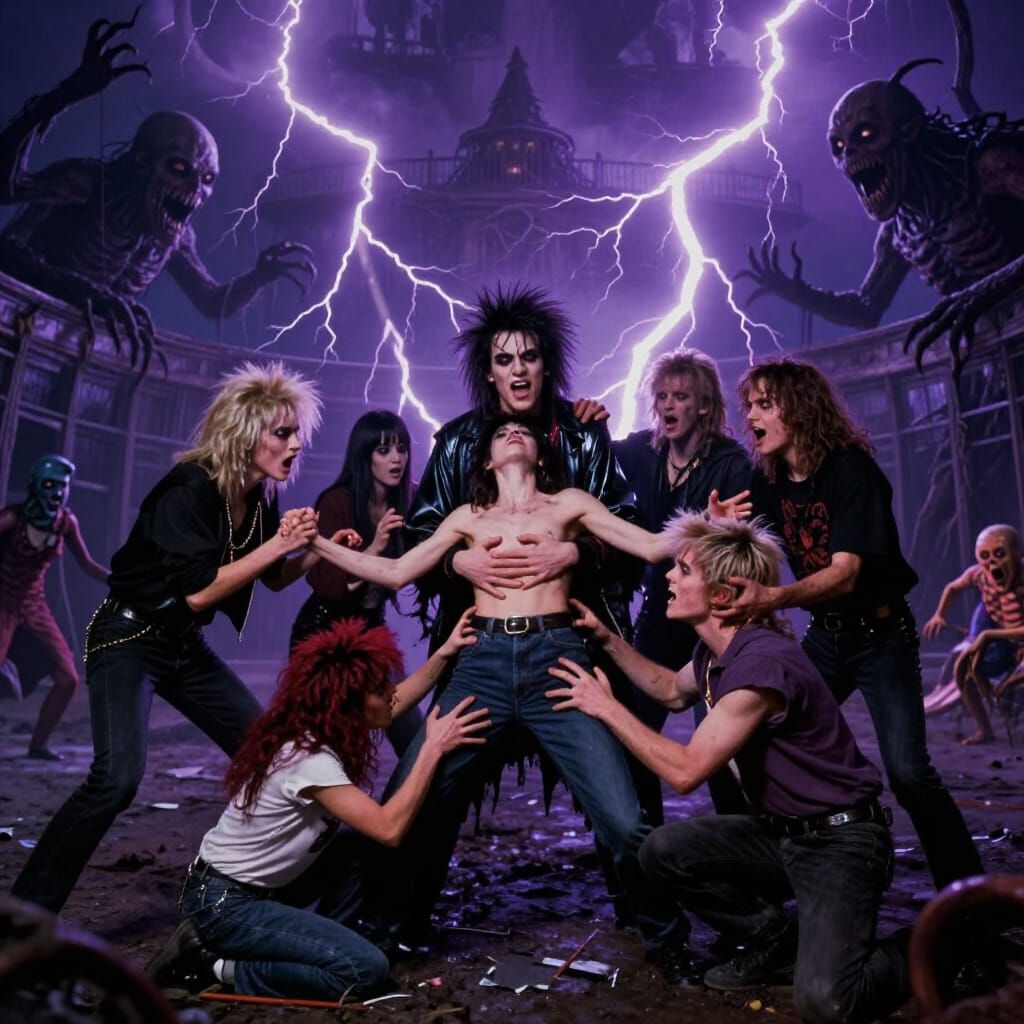Intense 80s VHS style photo of punks facing humiliation by wizards amid lightning and monsters. Features a spooky, goth punk aesthetic with practical effects.