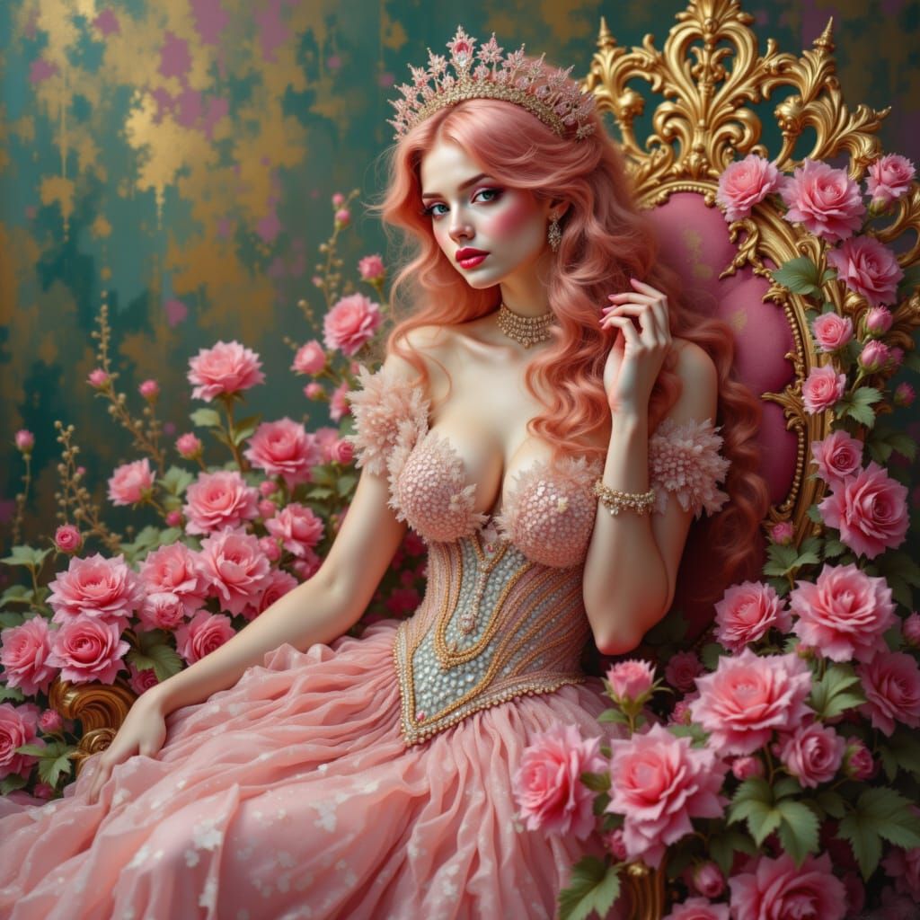 A digital portrait of an empress with rose gold hair and emerald eyes, wearing an ice pink dress with circuitry patterns. The empress sits on a throne of roses, wearing a starlight crown, in a futuristic style.