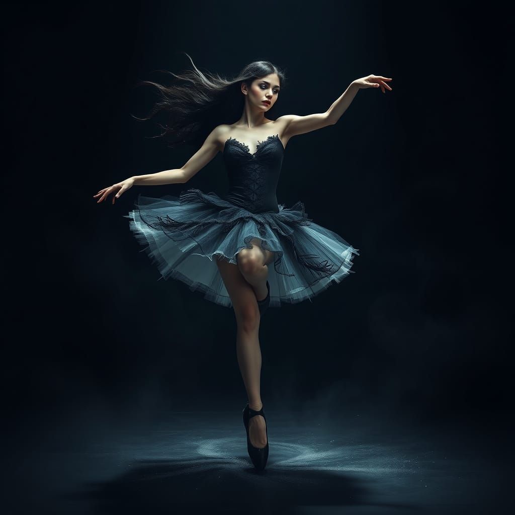 A beautiful, eerie image of a gothic ballerina dancing on a dimly lit stage, surrounded by swirling shadows and adorned with tattered lace and feathers.