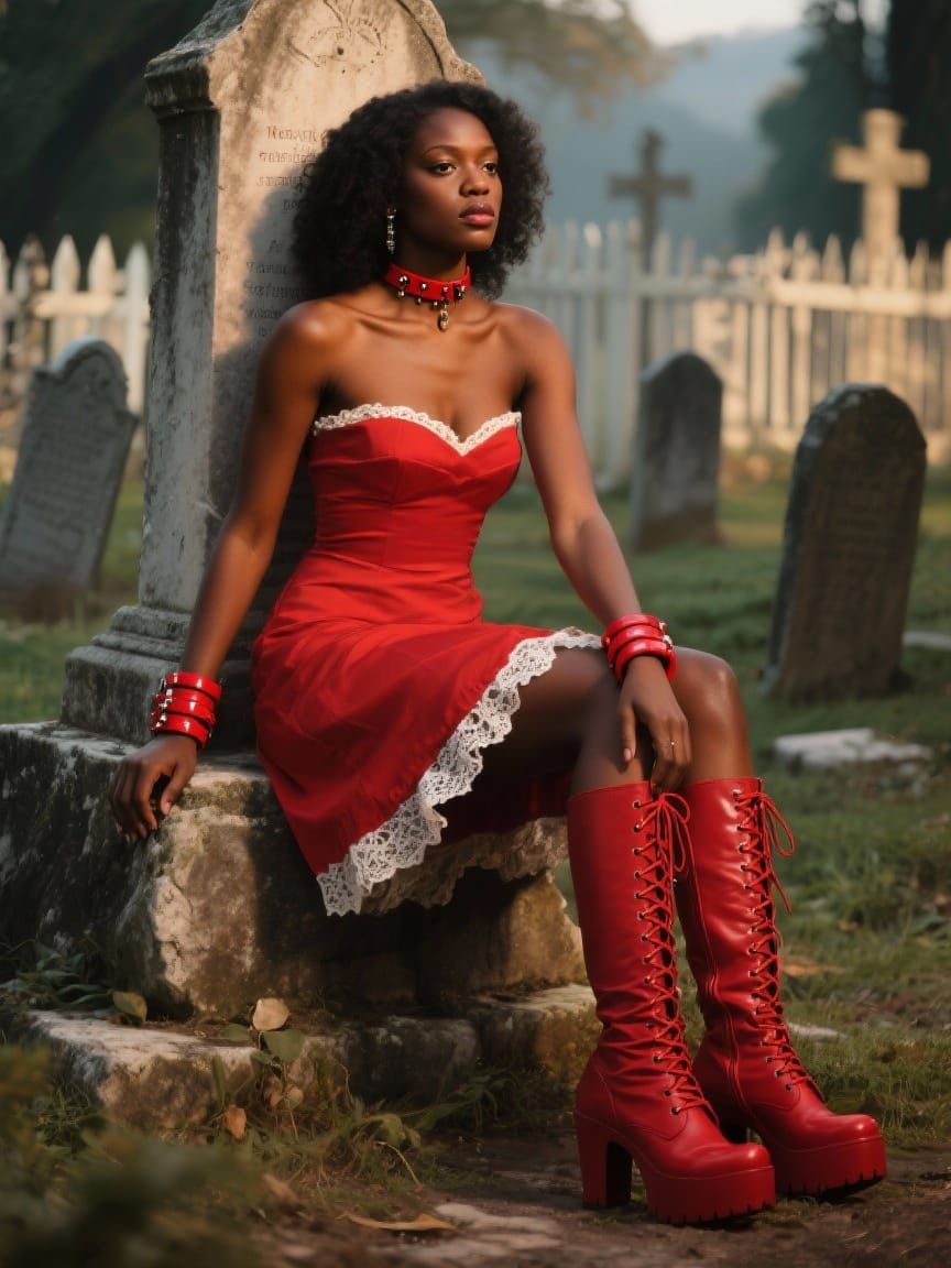 A striking woman with mahogany skin wears a red strapless dress and platform boots, seated on a monument in a softly blurred graveyard. Inspired by dramatic lighting and vibrant colors.