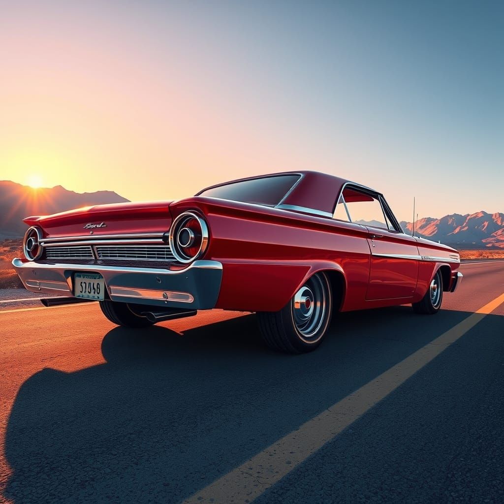 A vibrant image of a Ford Galaxie 500 parked on a desolate highway during sunset. The classic American muscle car is depicted with reflective chrome and dynamic shadows in a retrofuturistic style.