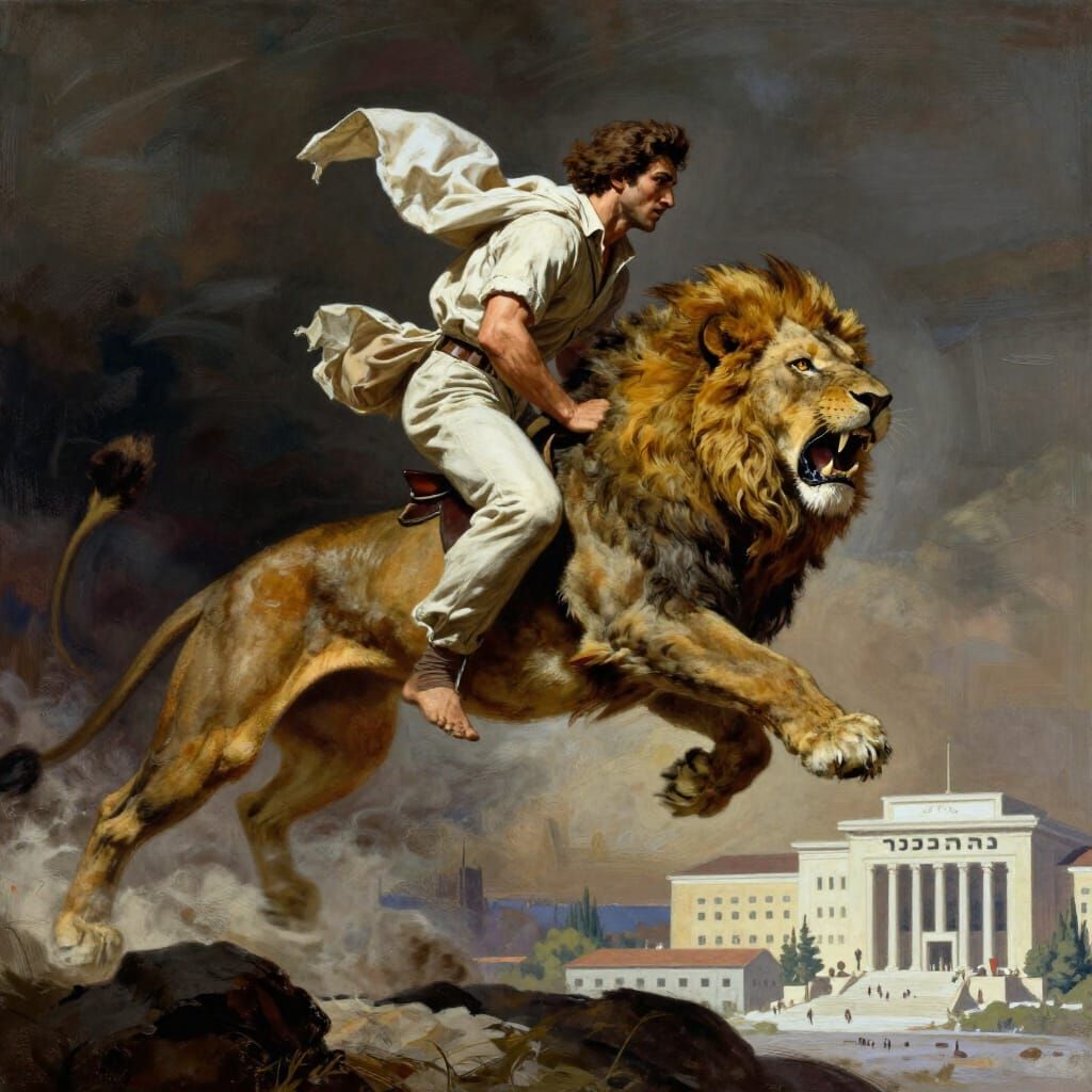 This image depicts a man leaping onto a lion's back, with a synagogue visible in the background. It features dramatic lighting, motion blur, and a desaturated color palette, evoking epic fantasy art.