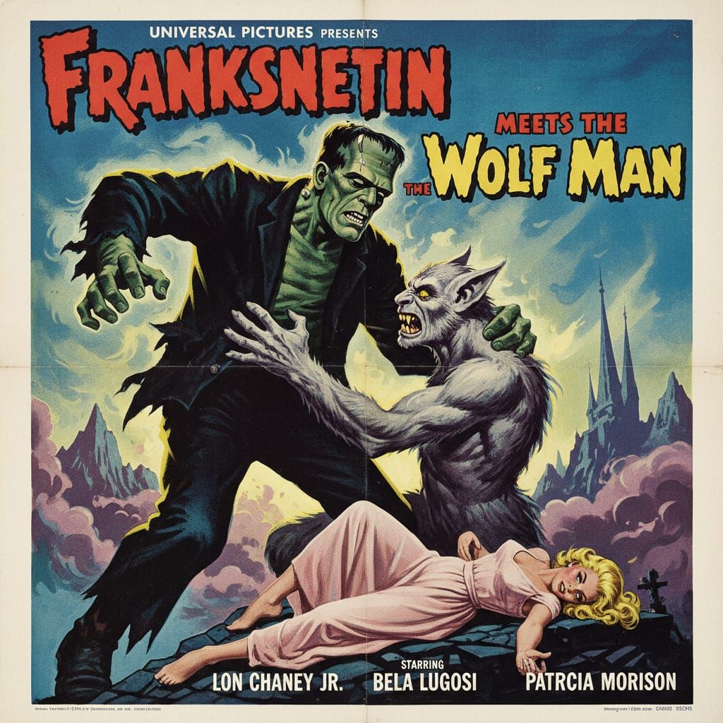 This image shows a vintage movie poster featuring Frankenstein's monster battling the Wolf Man. A blonde woman in a pink dress lies helpless below, all set against a vibrant, chaotic, and stylized background.