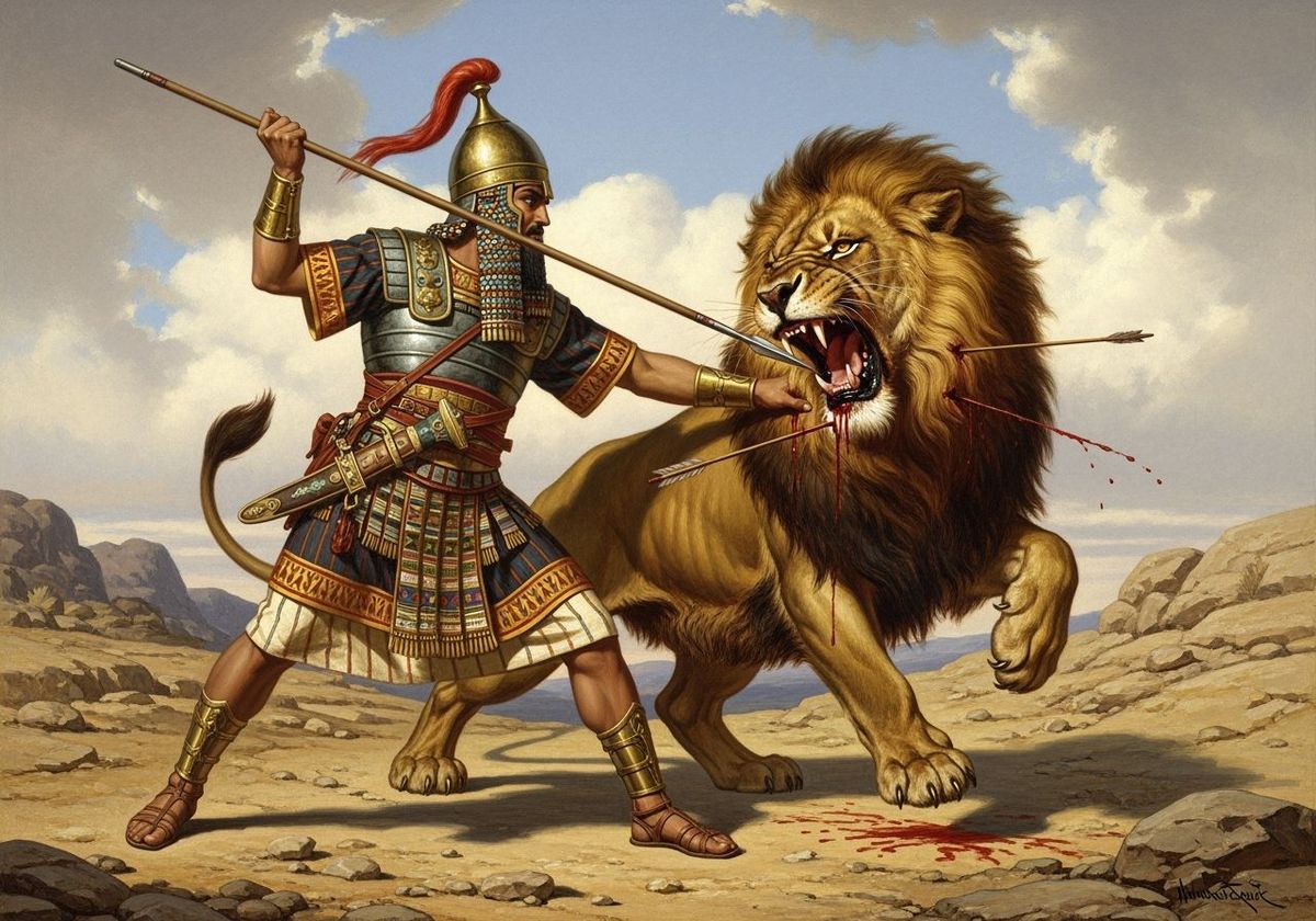 This image shows a nobleman hunting a lion in an arid landscape. The artwork combines historical accuracy and narrative drama with meticulous detail in the rendering of textiles, light, and shadow.