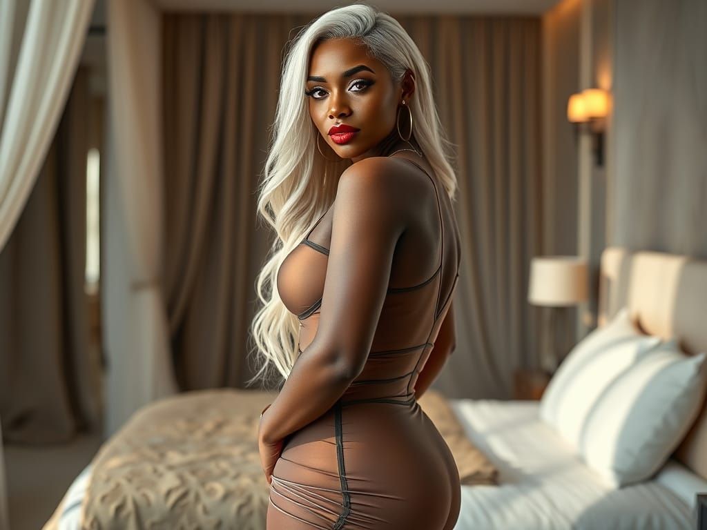 This image shows a glamorous woman with fair skin and long white hair in a transparent dress. The fashion photography style features detailed textures and cinematic shadows in a luxury bedroom.