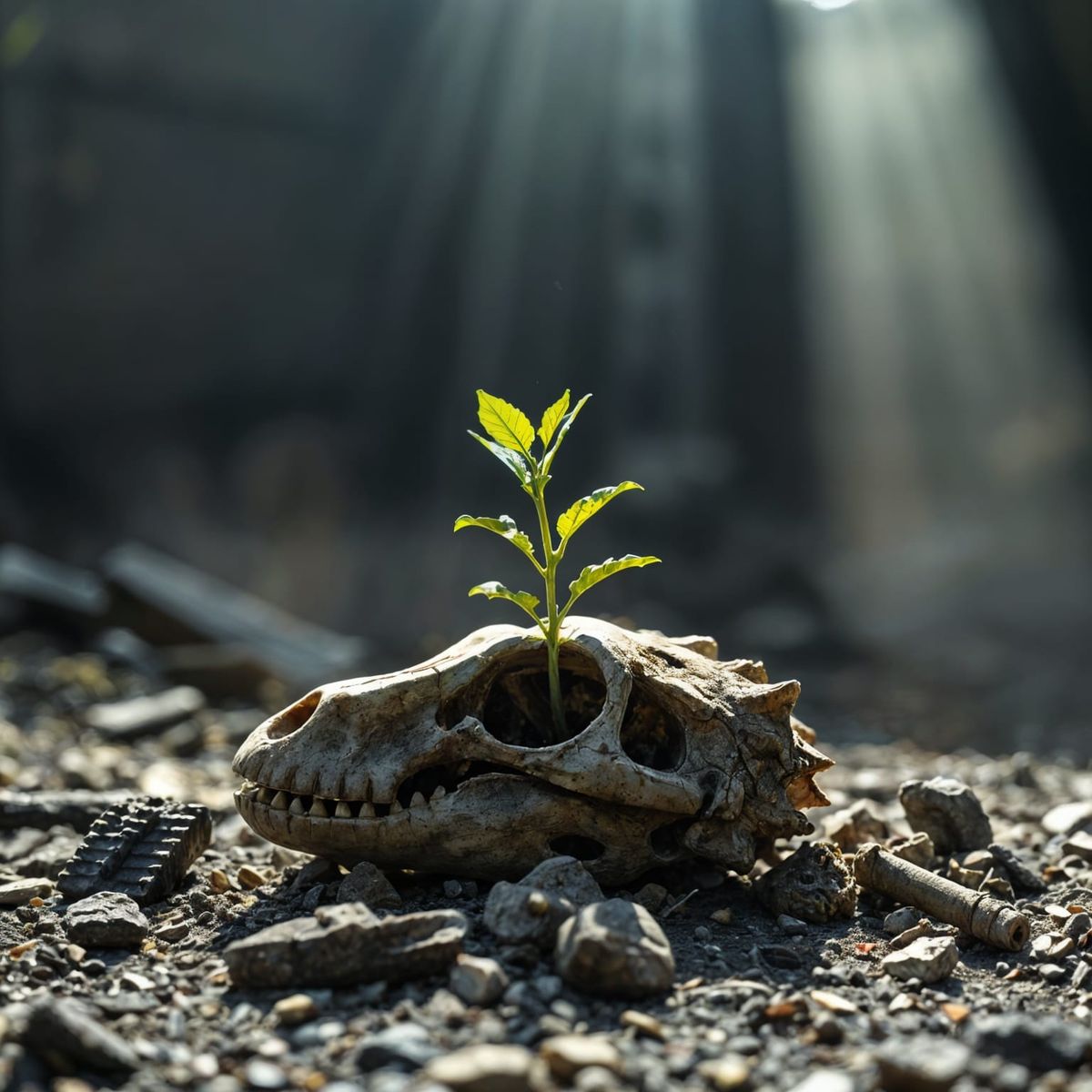 This image shows a tiny plant growing out of a reptilian skull amidst ash and destruction. Dusty sunbeams illuminate this focal point of hope in a dreary, surreal scene.