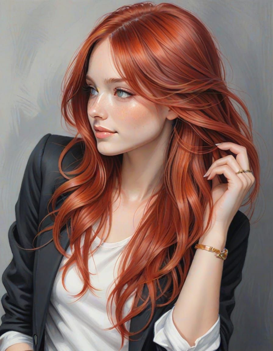 A whimsical, hand-drawn portrait of a young girl with long, flowing red hair, set against a soft, blurred background. The illustration features warm, vibrant colors and visible pencil strokes, with a focus on the girl's expressive eyes and gentle smile.